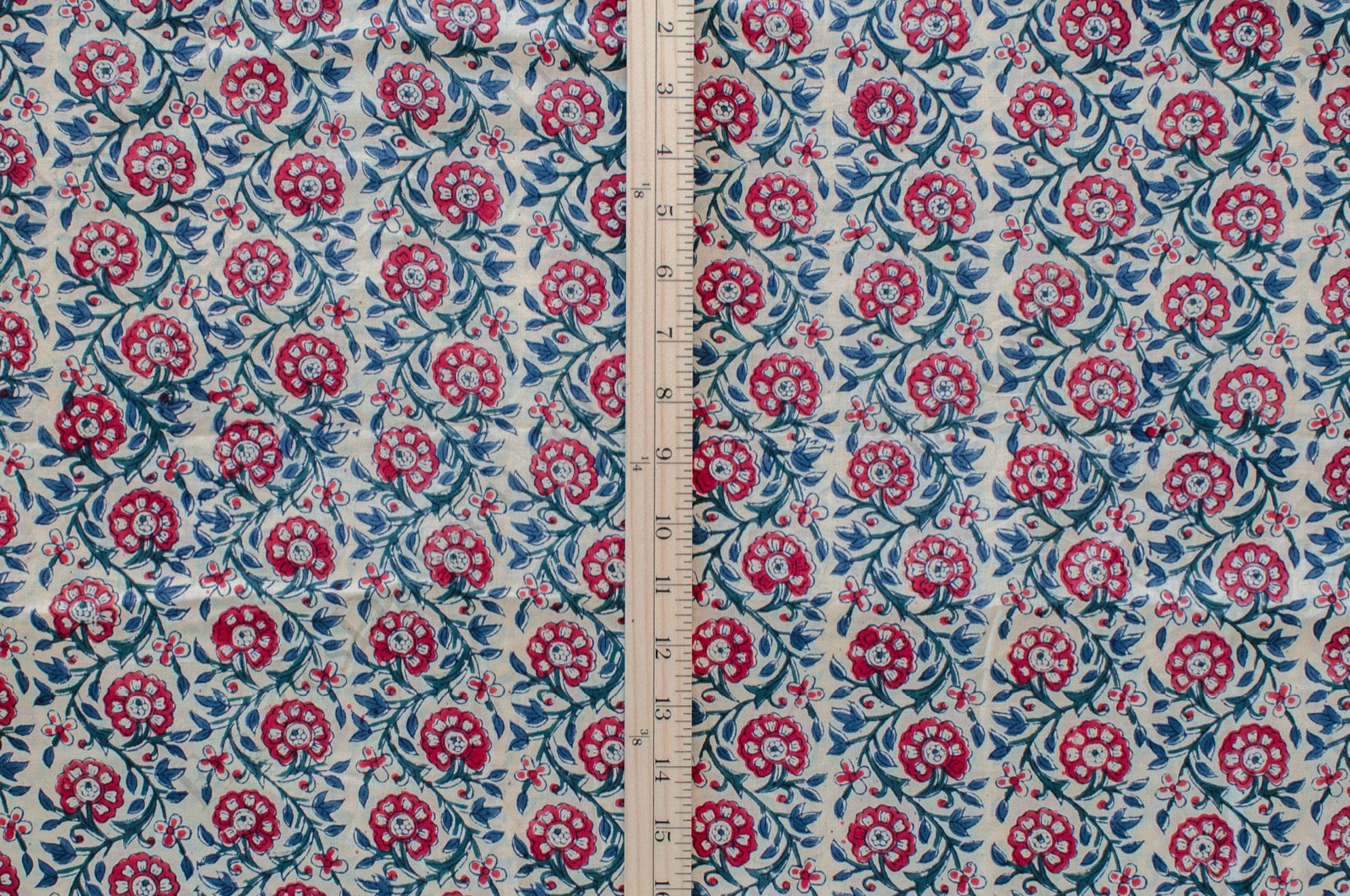Bursting with rich color, this red, blue, and green floral fabric is hand block printed by artisans in Jaipur, India. The intricate pattern and vivid hues create an eye-catching yet timeless look, perfect for garments, accessories, or decorative projects.